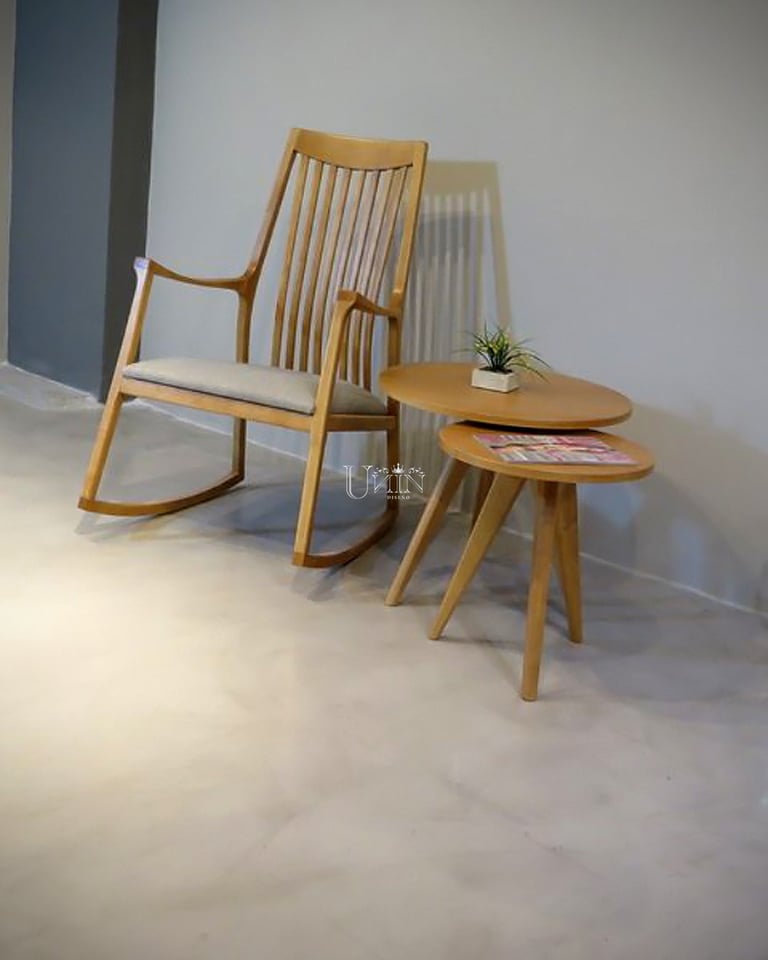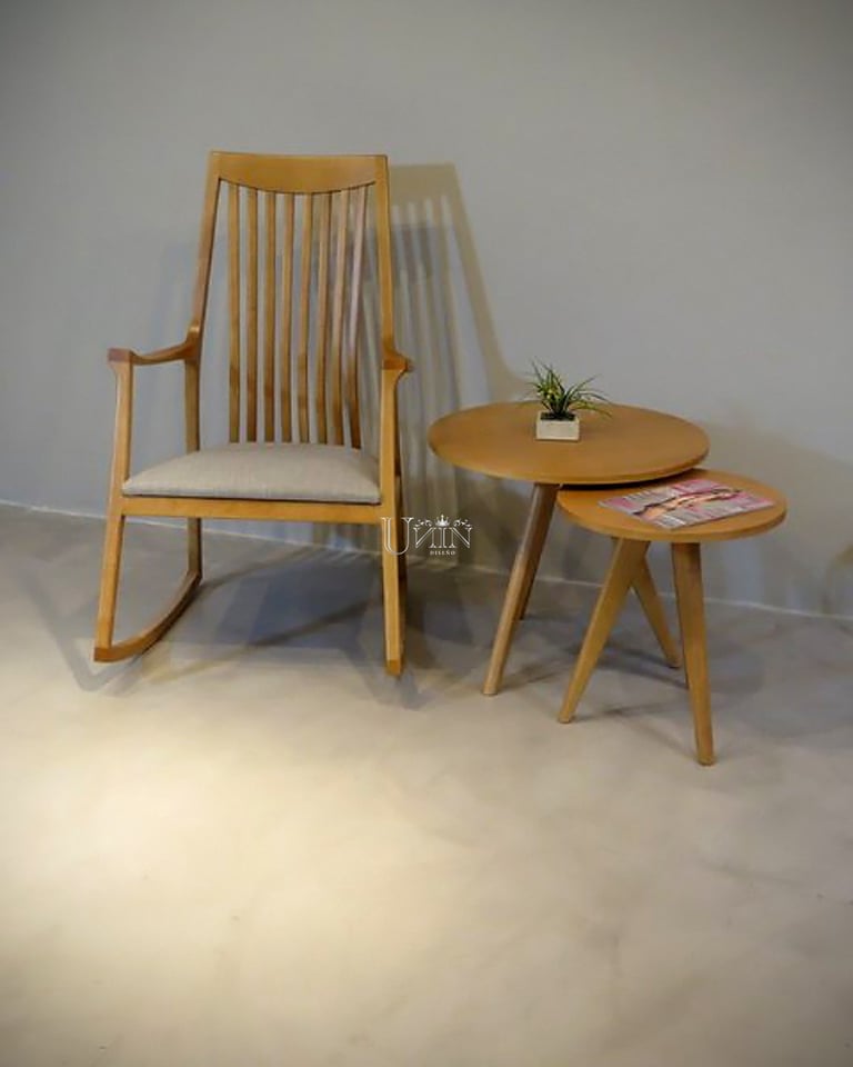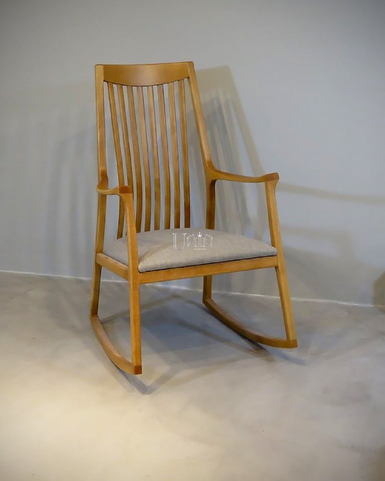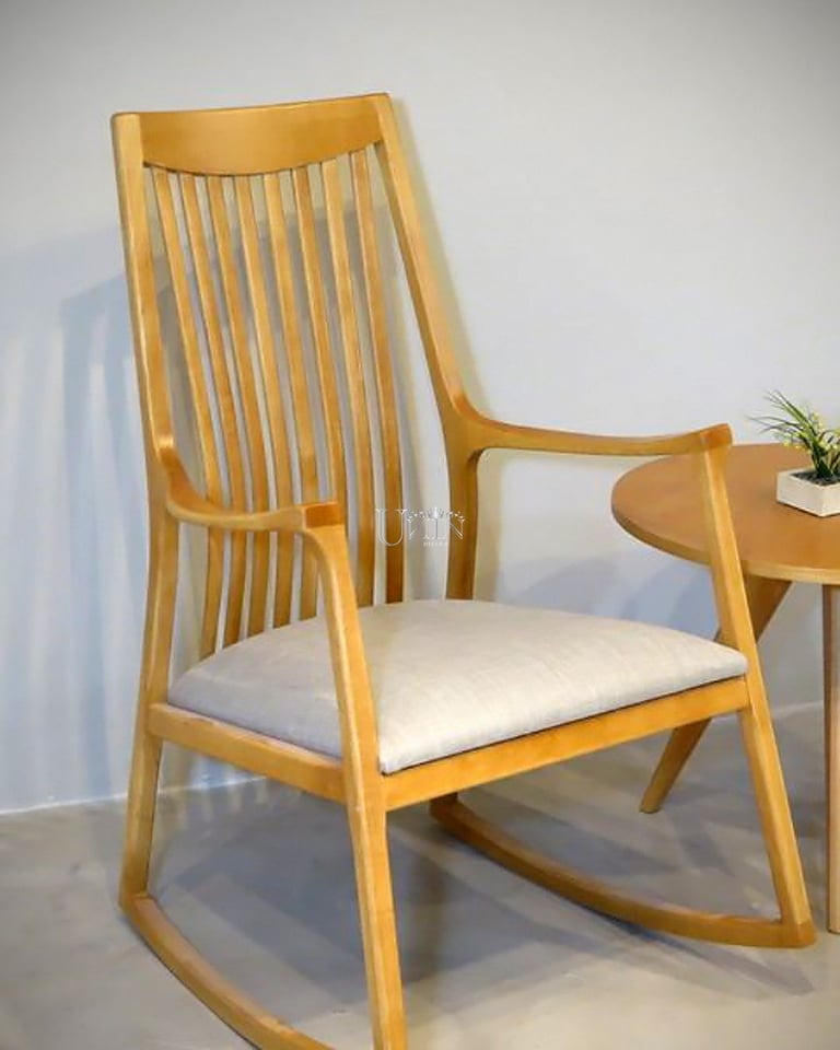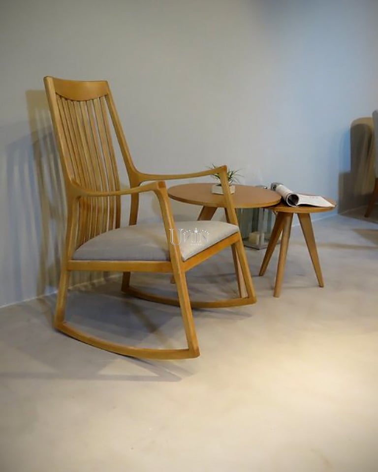Mecedora de diseño estilizado y elegante con madera a la vista, asiento tapizados.