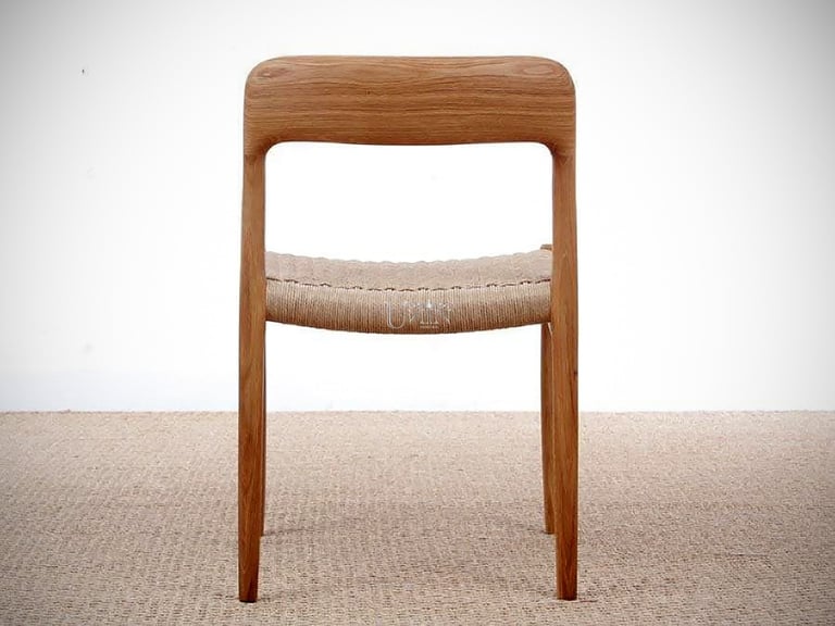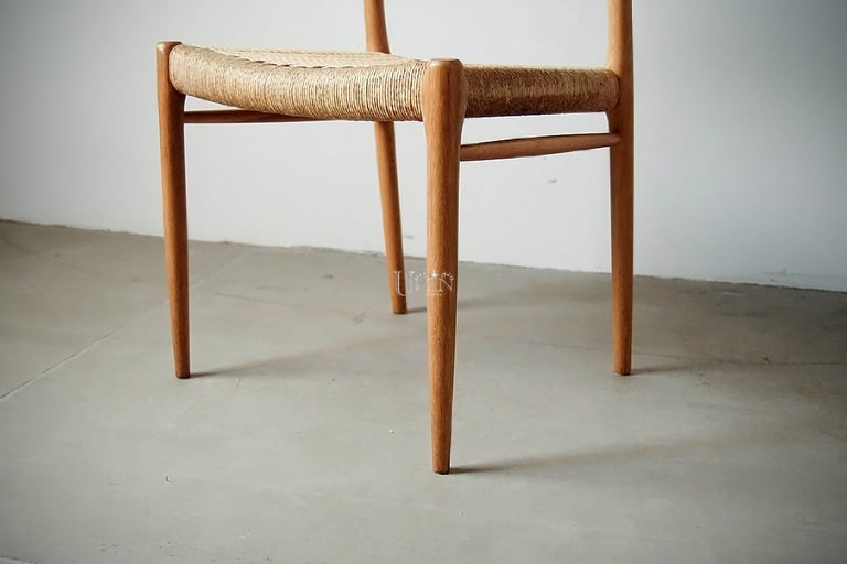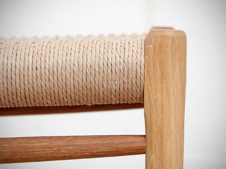 Madera de lenga, paraíso o petiribí . Terminación con laqueado poliuretánico de alta calidad y resistencia. Asiento tejido a mano con material Kraft.