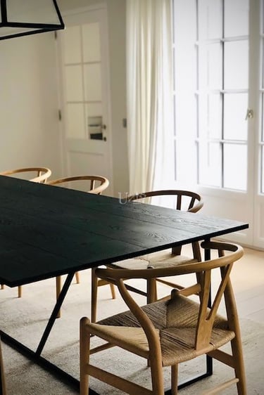 Madera de lenga, paraíso o petiribí. Terminación con laqueado poliuretánico de alta calidad y resistencia. Asiento tejido a mano con material Kraft.